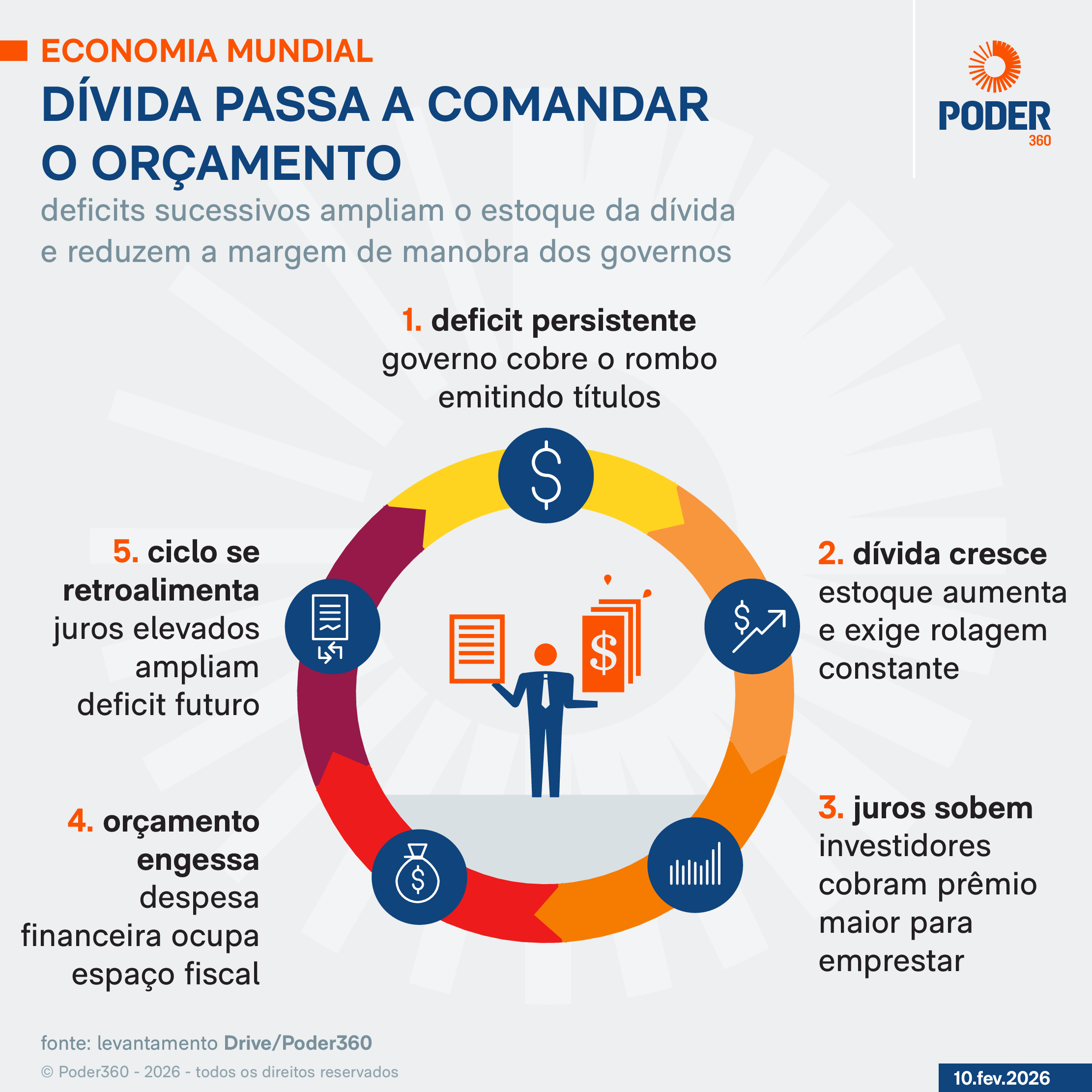 Países como Japão, Itália e EUA convivem com um mecanismo de asfixia orçamentária, cujos deficits recorrentes exigem emissões constantes de títulos, elevando juros que consomem o espaço de investimento estratégico. Economistas ouvidos pelo Poder360 chamam esse ciclo de “efeito bola de neve” –quando o crescimento da dívida por juros supera o crescimento econômico nominal.