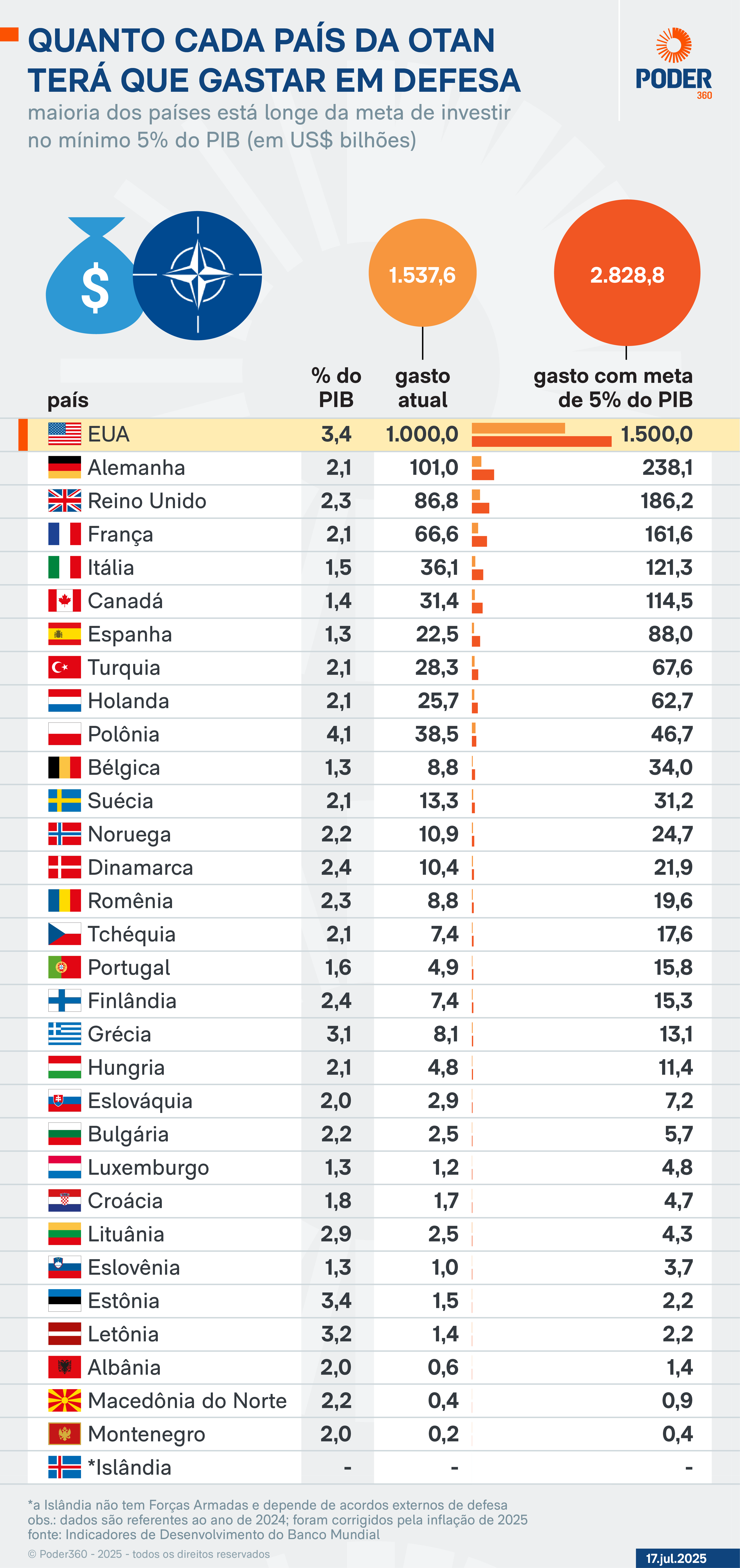 Há também a necessidade de aumentar os gastos militares para autodefesa em um contexto de maior instabilidade geopolítica e reconfiguração do sistema de segurança europeu. Os integrantes da Otan (Organização do Tratado do Atlântico Norte) elevaram a meta de investimento em defesa de 2% para 5% do PIB até 2035, pressionando ainda mais orçamentos já engessados.