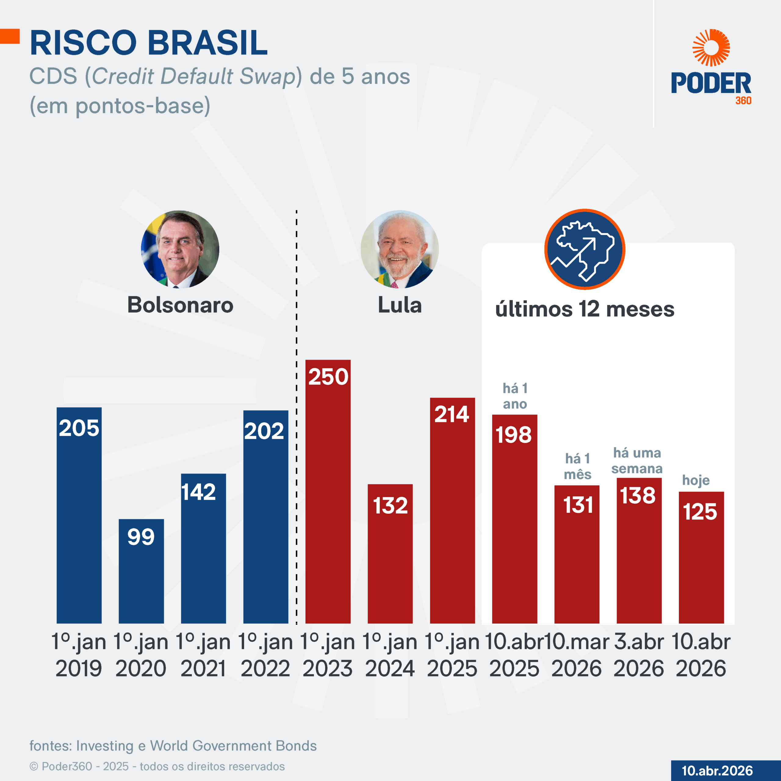 Usado para medir a confiança na economia, o risco-país, ou CDS (Credit Default Swap) de 5 anos, registrou 125 pontos na 6ª feira (10.abr), o menor patamar semanal desde fevereiro de 2024. Há 1 ano (10.abr.2025), registrava 198.