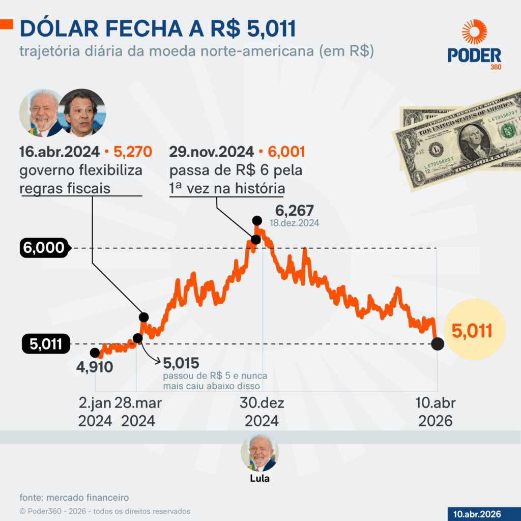 O dólar comercial caiu para R$ 5,011. A moeda norte-americana recuou 1,02% nesta 6ª feira (10.abr.2026) e 2,87% na semana. A última vez que fechou abaixo de R$ 5 foi em 27 de março de 2024, quando encerrou o dia aos R$ 4,979, ou seja, está há 744 dias acima deste patamar –mais de 2 anos.