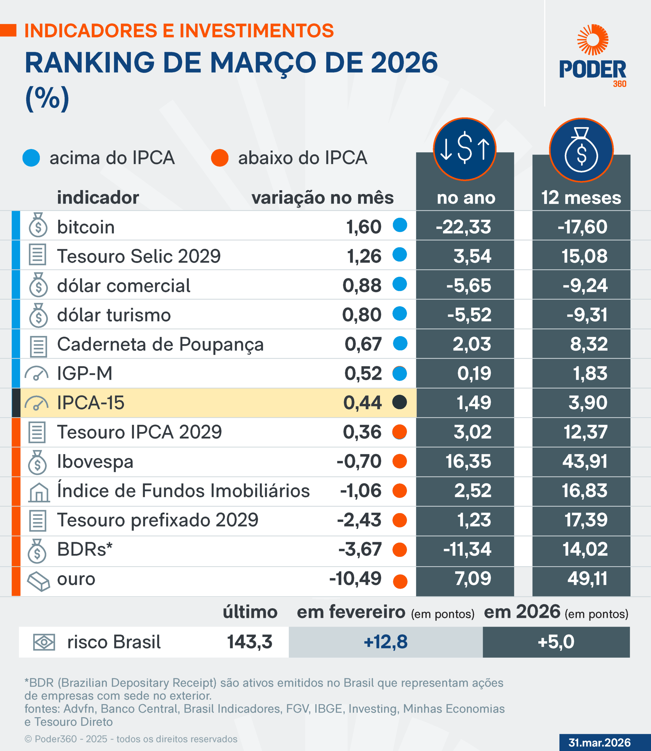 O pior desempenho foi do ouro, com queda 10,49%. O metal teve forte alta ao longo de 2025 e 2026. No acumulado de 12 meses, subiu 49,11%, sendo a principal modalidade de investimento no prazo de 1 ano.