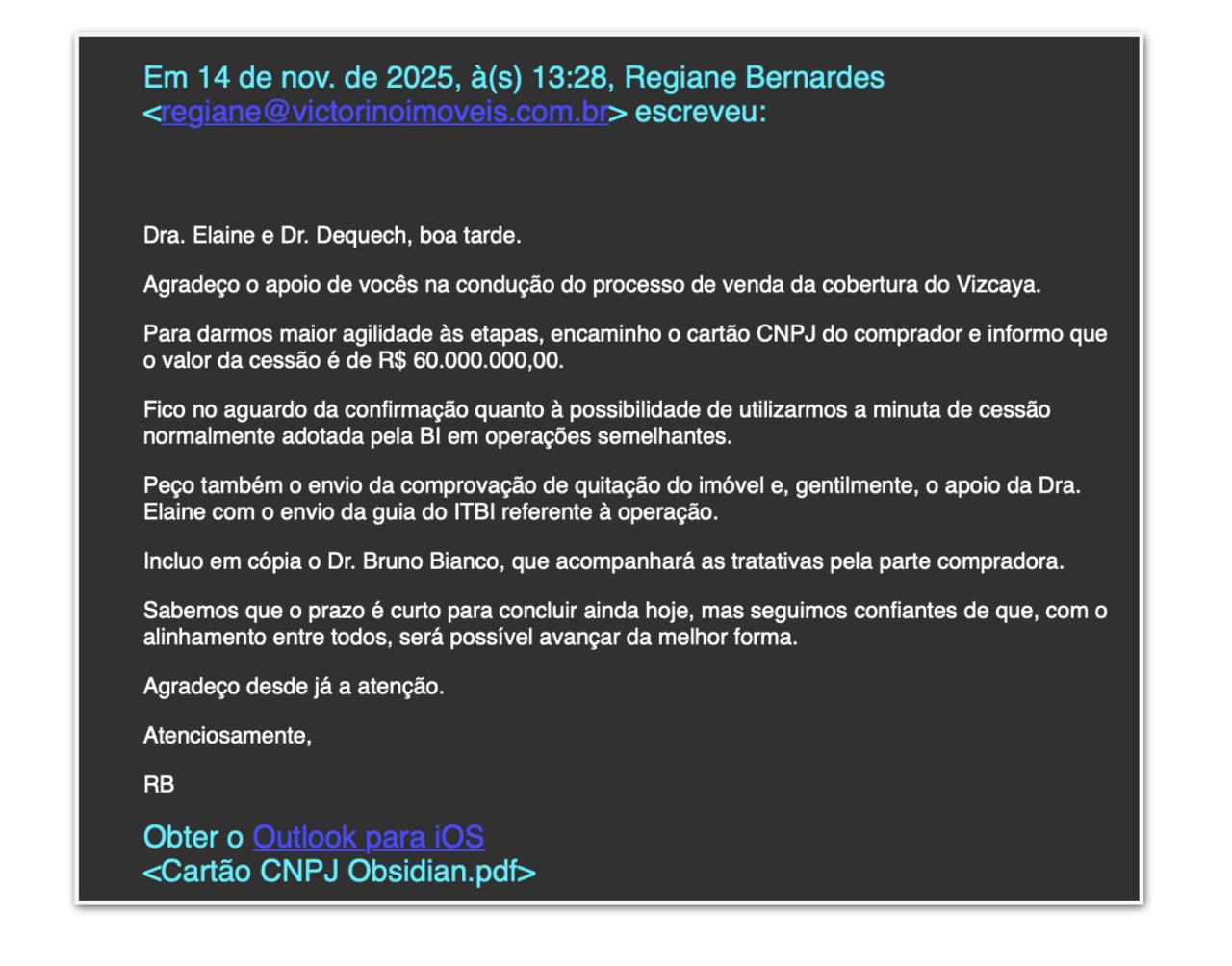 E-mails também mostram tratativas relacionadas a um imóvel de alto padrão no empreendimento Vizcaya, em São Paulo. As mensagens discutem a cessão da cobertura e a necessidade de documentos que comprovem quitação do imóvel e titularidade da propriedade para avançar na negociação.