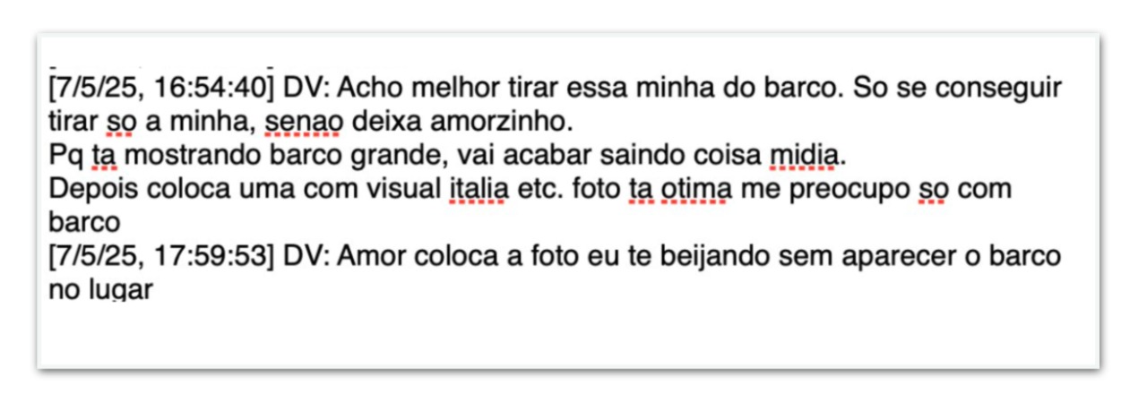 Na conversa, o empresário afirma que a imagem “está mostrando barco grande” e que isso poderia “acabar saindo coisa [na] mídia”. Em seguida, ele sugere substituir a foto por outra imagem em que aparece beijando a namorada, mas sem que a embarcação fique visível.