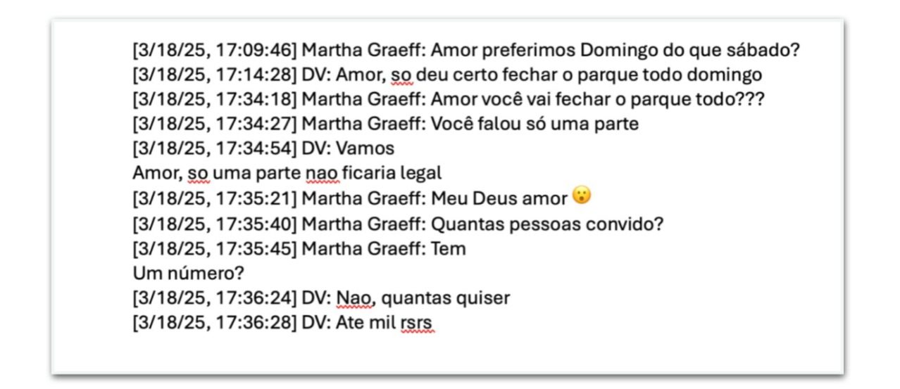 Em um diálogo de 18 de março de 2025, Vorcaro afirma que havia conseguido “fechar o parque todo domingo” para a realização de um evento. Na conversa, ao ser questionado sobre o número de convidados, ele responde que não havia limite e afirma: “até 1.000” pessoas.