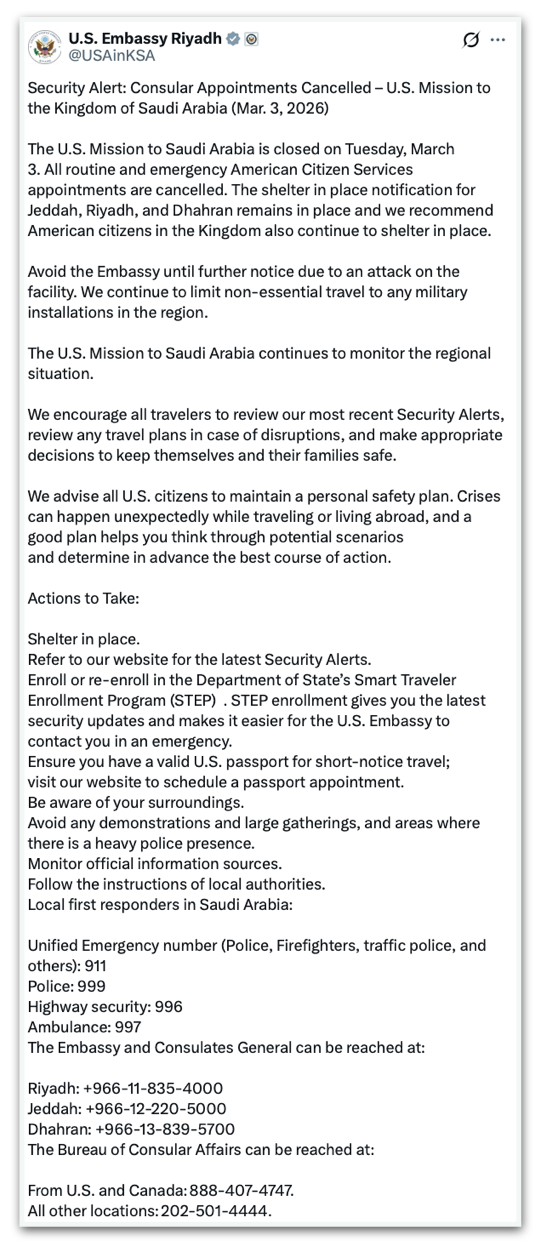 A embaixada emitiu um aviso nas redes sociais para que cidadãos norte-americanos em Riad, Jidá e Dhahran busquem abrigo imediatamente. Recomendou que evitassem a embaixada até novo aviso por causa do ataque às instalações.