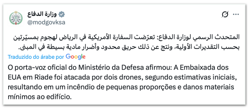 A embaixada dos Estados Unidos em Riad, na Arábia Saudita, foi atingida por 2 drones nesta 3ª feira (3.mar.2026), no horário local –noite de 2ª feira (2.mar) no Brasil. O Ministério da Defesa da Arábia Saudita publicou na rede social X que houve um “incêndio de pequena escala e danos materiais mínimos ao edifício, segundo estimativas iniciais”.