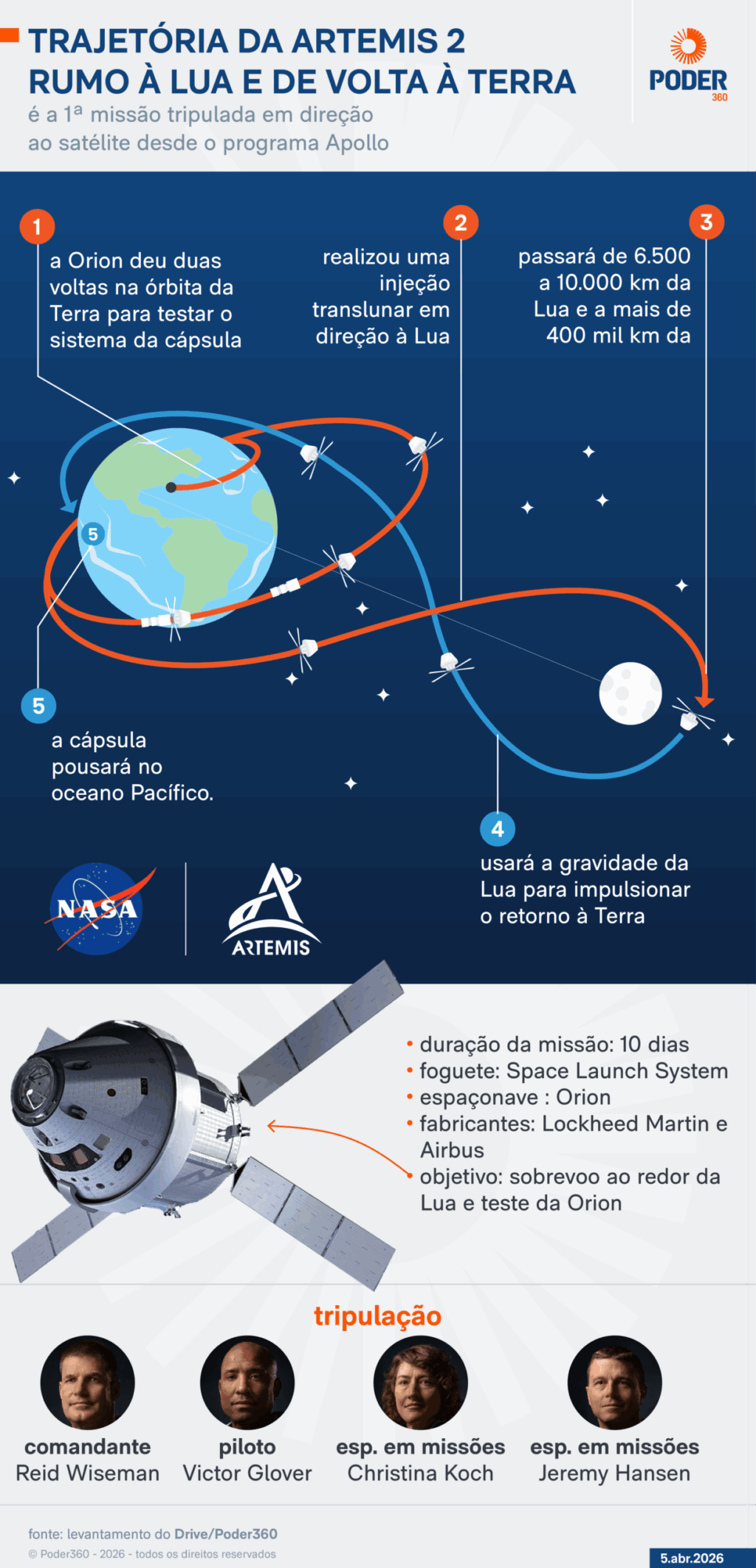 A missão Artemis 2, o 1º voo tripulado do programa lunar da Nasa desde 1972, foi lançada em 1º de abril de 2026, do Centro Espacial Kennedy, nos EUA. Quatro astronautas –Reid Wiseman, Victor Glover, Christina Koch e Jeremy Hansen (Agência Espacial Canadense)– estão a bordo da Orion, em um voo ao redor da Lua com retorno previsto à Terra em cerca de 10 dias.