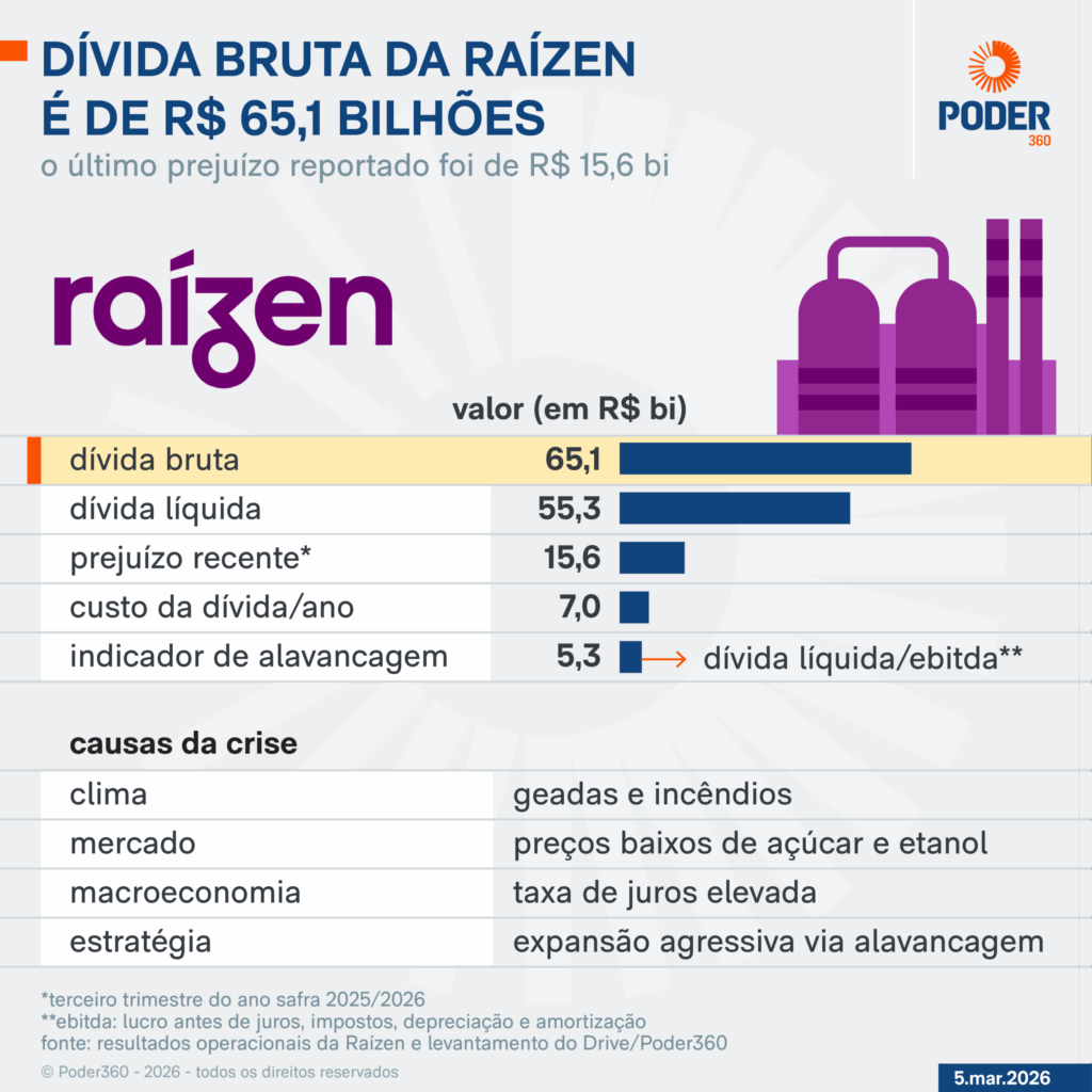 A deterioração financeira da companhia nos últimos meses pressionou a estrutura de capital da empresa. A Raízen acumulou prejuízos bilionários e aumento expressivo da dívida depois de anos de investimentos elevados.