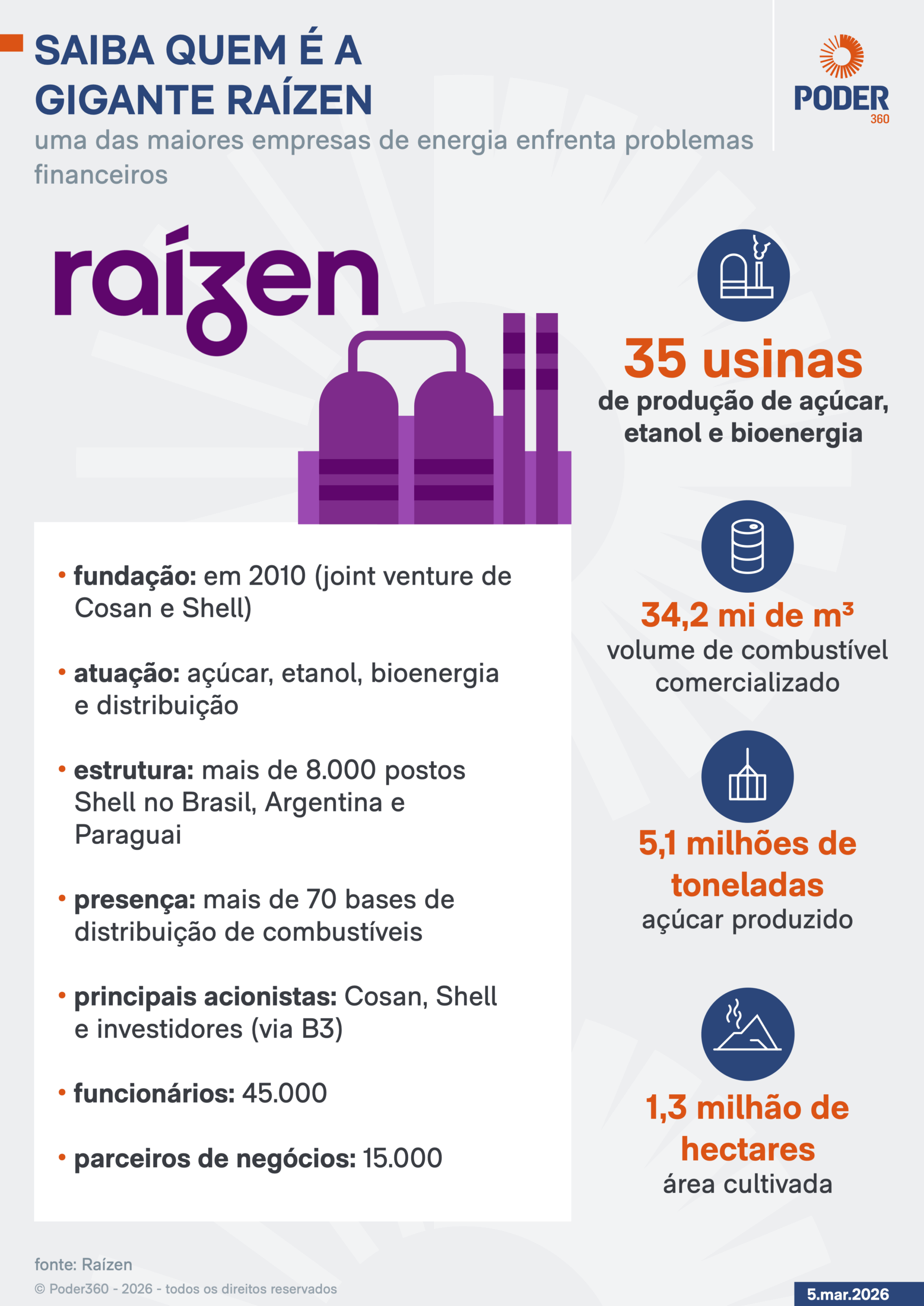 A Raízen é uma das maiores companhias de bioenergia do mundo. Criada em 2010 a partir da união de ativos da Cosan e da Shell, atua na produção de açúcar, etanol, bioenergia e distribuição de combustíveis.