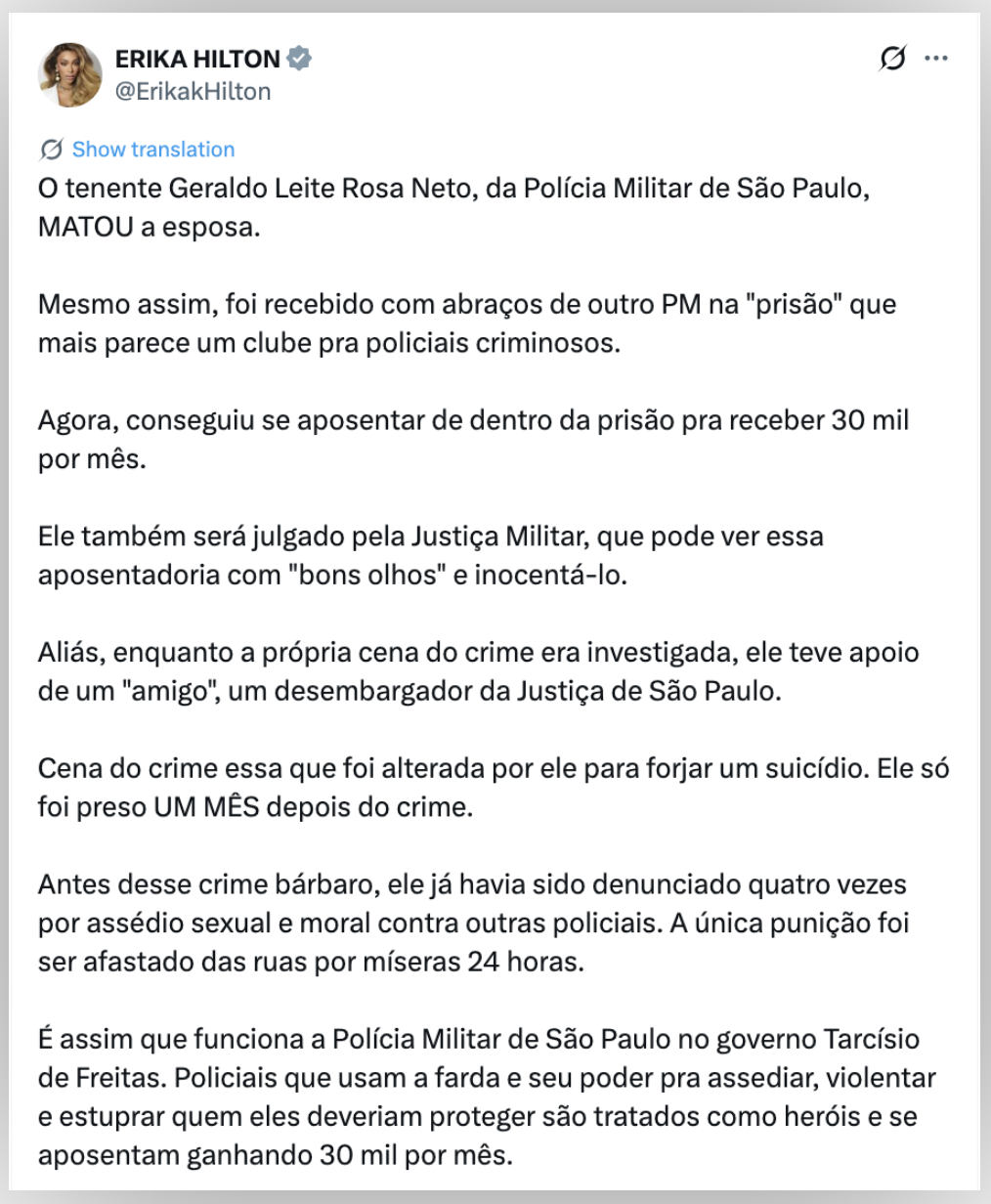 Hilton declarou ainda que houve interferência durante a investigação inicial. De acordo com ela, a cena do crime teria sido alterada para simular suicídio, e a prisão ocorreu apenas um mês depois. A parlamentar também citou apoio de um desembargador do Tribunal de Justiça de São Paulo ao policial no início do caso.