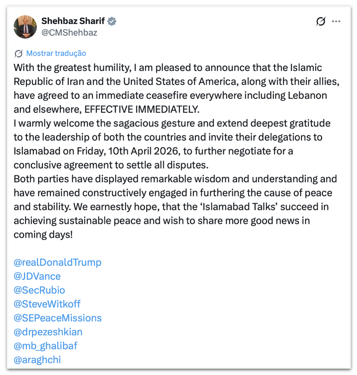 Em publicação no X, Sharif convidou as delegações para um encontro em Islamabad na 6ª feira (10.abr) “para prosseguirem as negociações visando um acordo definitivo para a resolução de todas as disputas”.