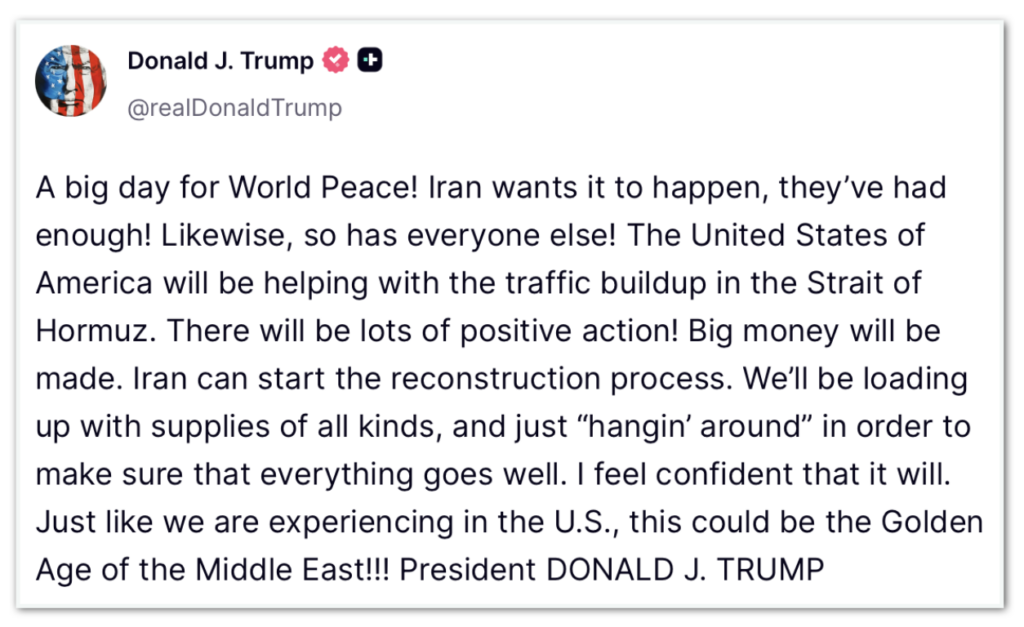 O republicano afirmou que “essa pode ser a era de ouro do Oriente Médio”, assim como, segundo ele, está sendo para os EUA. Disse que ajudará o Irã a lidar com o aumento do tráfego no estreito de Ormuz, cuja reabertura é parte do acordo de cessar-fogo.