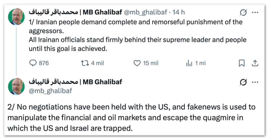 Na 2ª feira (23.mar), depois que Trump disse haver um diálogo em curso entre seu governo e autoridades iranianas, Ghalibaf usou as redes sociais para negar a informação.