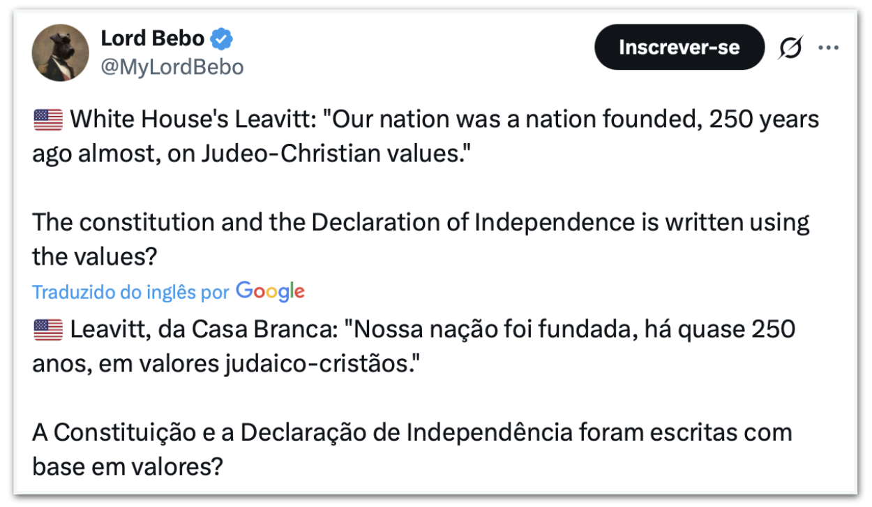 A declaração da porta-voz da Casa Branca repercutiu nas redes sociais, com muitos questionando a ideia de que os EUA tenham sido fundados com base em valores judaico-cristãos. Eis algumas publicações: