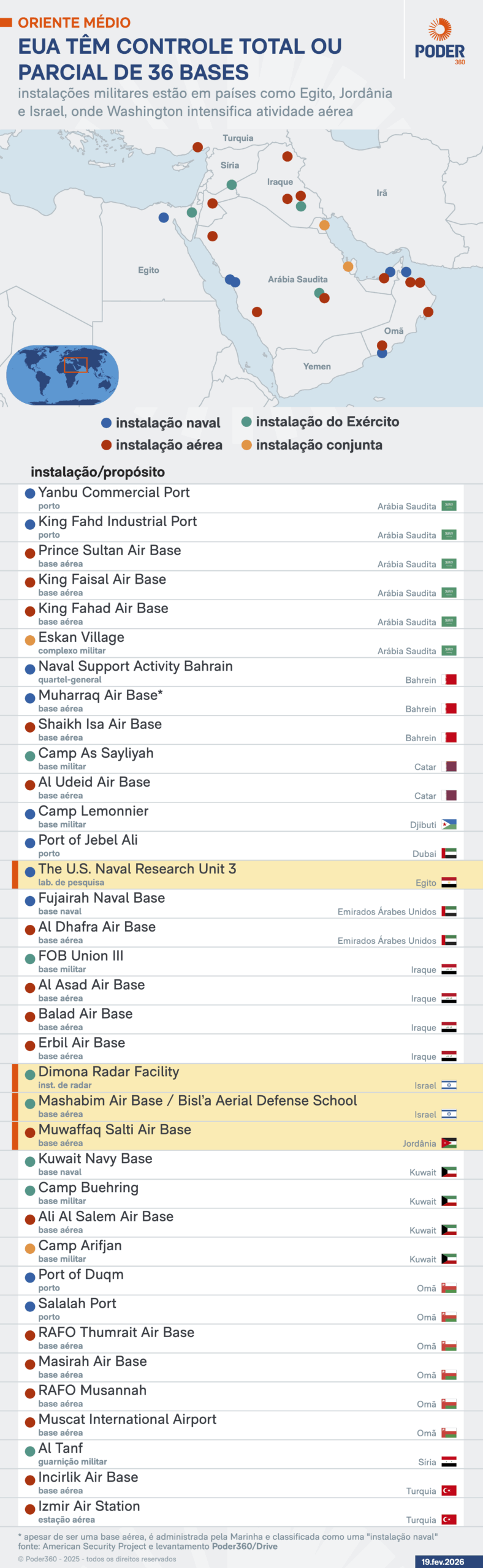 Os Estados Unidos mantêm 36 bases militares no Oriente Médio, onde tropas, equipamentos, unidades da Força Aérea e frotas da Marinha estão posicionadas em caso de uma incursão militar –como há chances de acontecer com o Irã. Desde o início de fevereiro, o governo do presidente Donald Trump (Partido Republicano) intensificou a campanha de “pressão máxima” para impedir o avanço do programa nuclear do país.