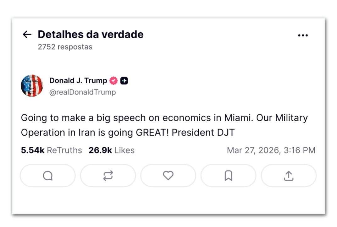 “Vou fazer um grande discurso sobre economia em Miami. Nossa operação militar no Irã está indo MUITO BEM! Presidente DJT”