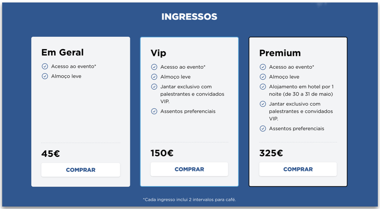 O pacote premium do congresso custa R$ 2 mil (€ 345). Esse ingresso dá direito de acesso às palestras, refeições, hospedagem em hotel, assentos preferenciais e jantar exclusivo com palestrantes e convidados especiais. O evento disponibiliza também ingressos mais baratos, que custam R$ 271 (€ 45) e R$ 940 (€ 150).