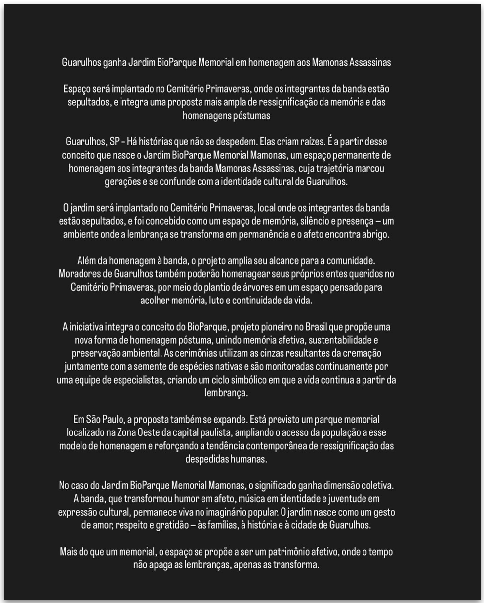 Em post nas redes sociais neste sábado (21.fev.2026), o perfil oficial do Mamonas e do cemitério escreveram que “mais do que um memorial, o espaço se propõe a ser um patrimônio afetivo, onde o tempo não apaga as lembranças, apenas as transforma”.