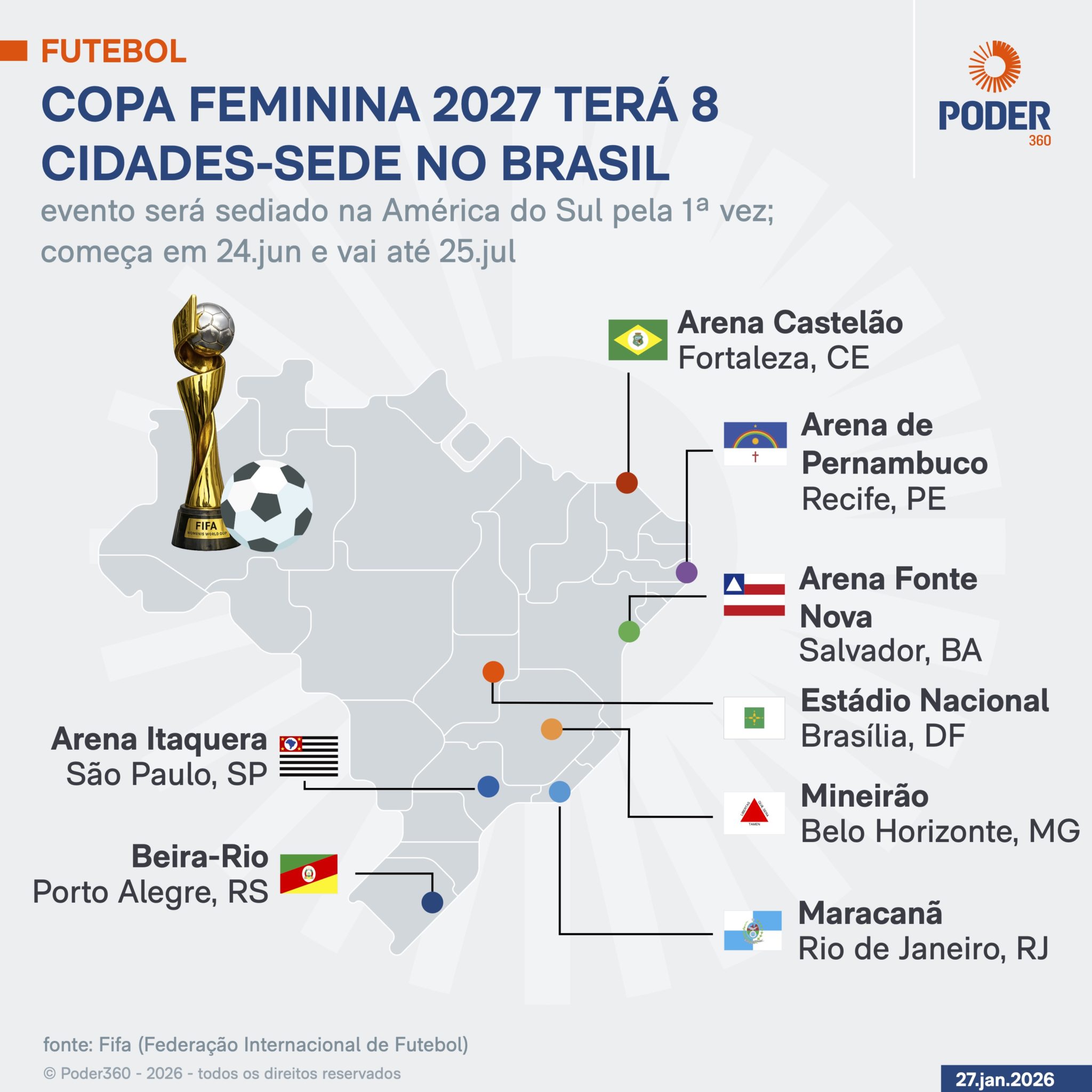 A Copa Feminina de 2027 será disputada de 24 de junho a 25 de julho. Oito estádios receberão jogos da competição: Maracanã (Rio de Janeiro), Arena Fonte Nova (Salvador), Arena Itaquera (São Paulo), Mineirão (Belo Horizonte), Estádio Nacional (Brasília), Arena Castelão (Fortaleza), Estádio Beira-Rio (Porto Alegre), Arena Pernambuco (Recife).