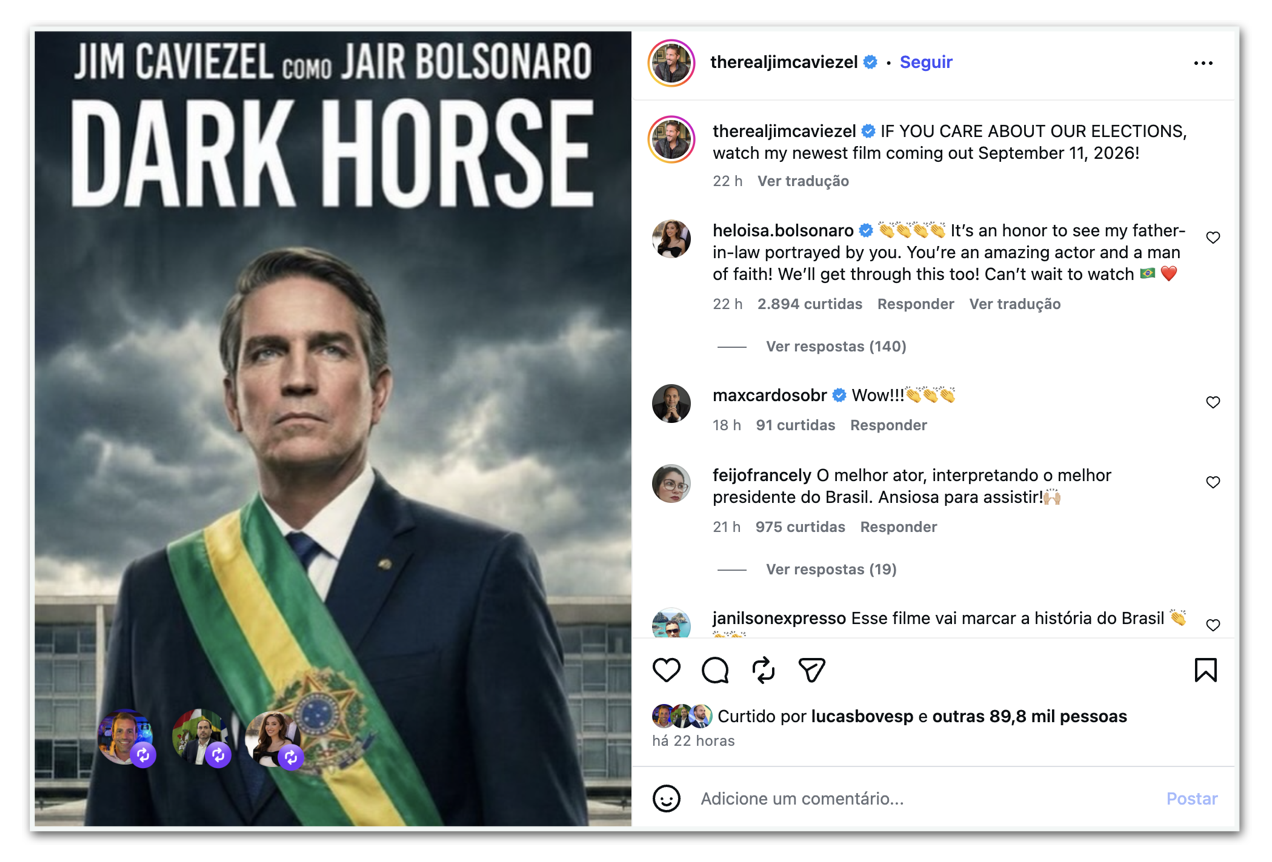 Protagonista do filme, Caviezel publicou em seu perfil oficial no Instagram um cartaz em que está caracterizado como Bolsonaro. Na legenda, escreveu: “Se você se importa com as nossas eleições, assista ao meu mais novo filme que vai sair em 11 de setembro de 2026!”