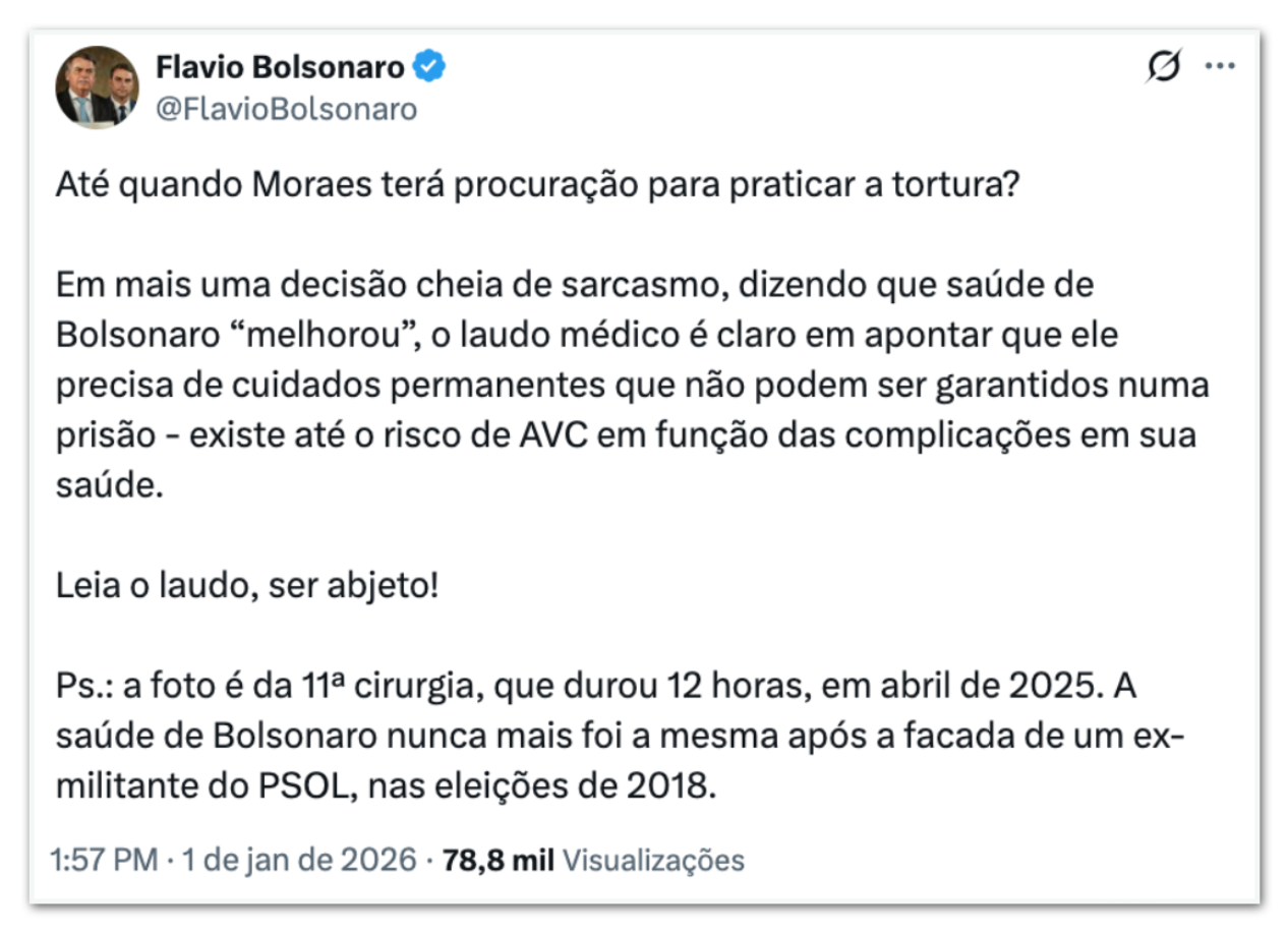 Em publicação em seu perfil no X, Flávio Bolsonaro classificou a decisão como “cheia de sarcasmo” e declarou que os documentos médicos indicam a necessidade de cuidados contínuos, incompatíveis com o ambiente prisional.