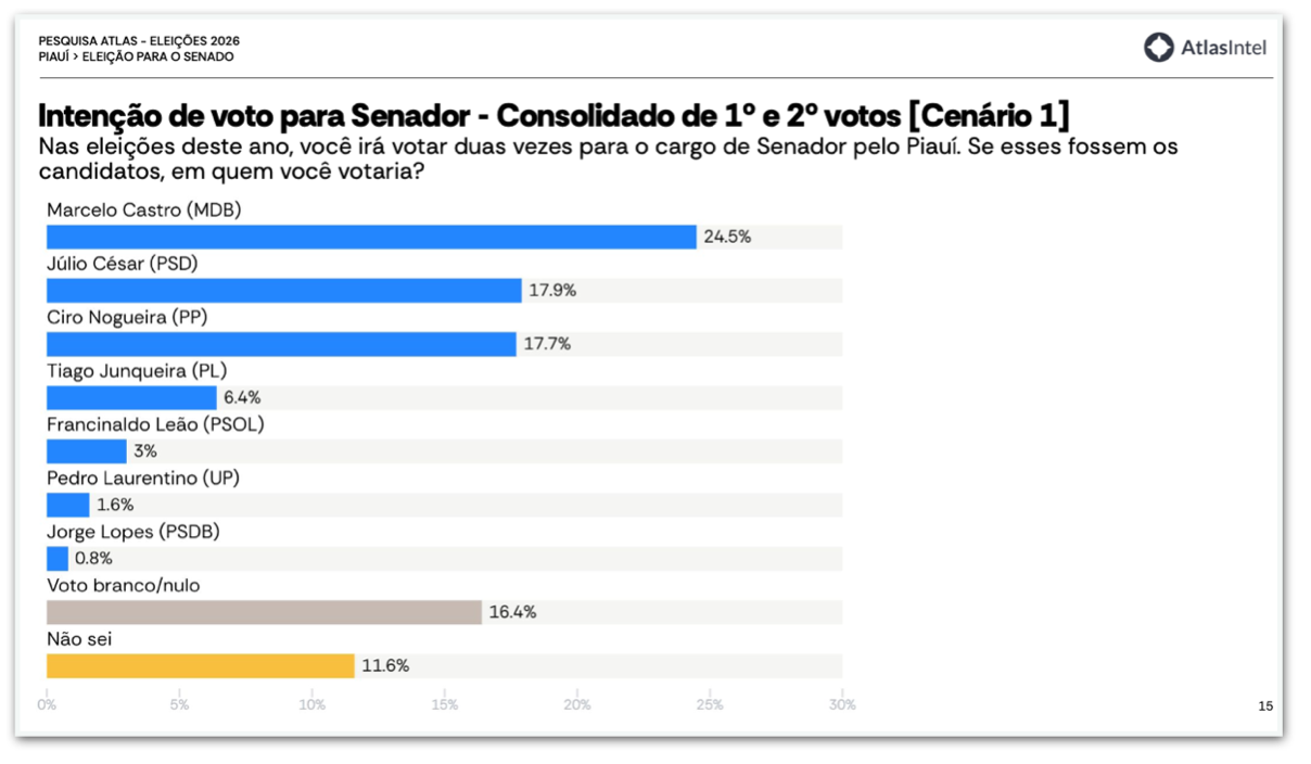 A AtlasIntel ouviu 1.208 eleitores no Estado do Piauí de 11 a 15 de março de 2026. A pesquisa tem margem de erro de 3 pontos percentuais, para mais ou para menos, e nível de confiança de 95%. O levantamento está registrado no TSE sob o nº PI-06908/2026, custou R$ 75.000 e foi pago com recursos próprios.