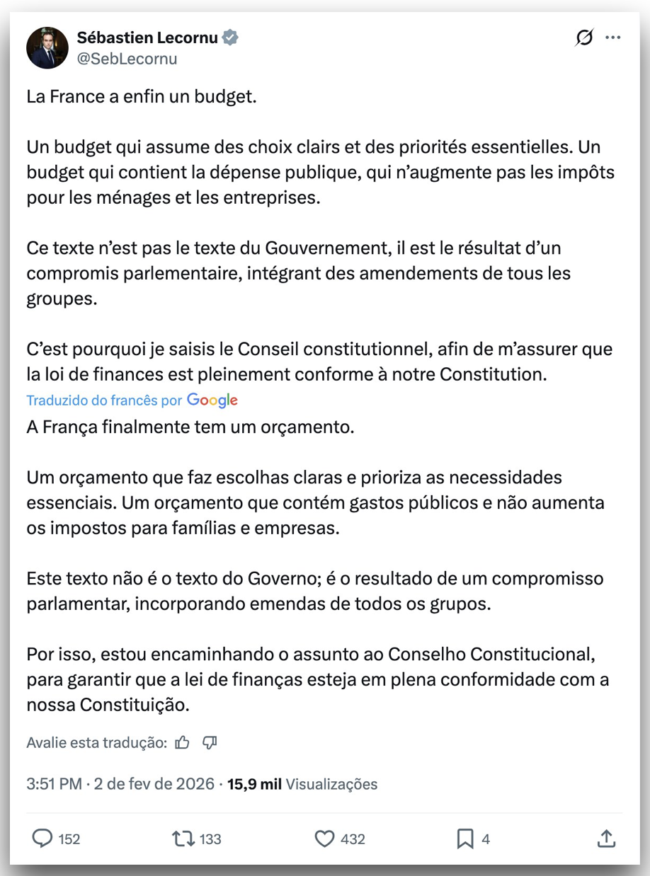 O primeiro-ministro informou que encaminhará o orçamento ao Conselho Constitucional, que irá analisar a conformidade do texto com a Constituição francesa antes de sua promulgação.