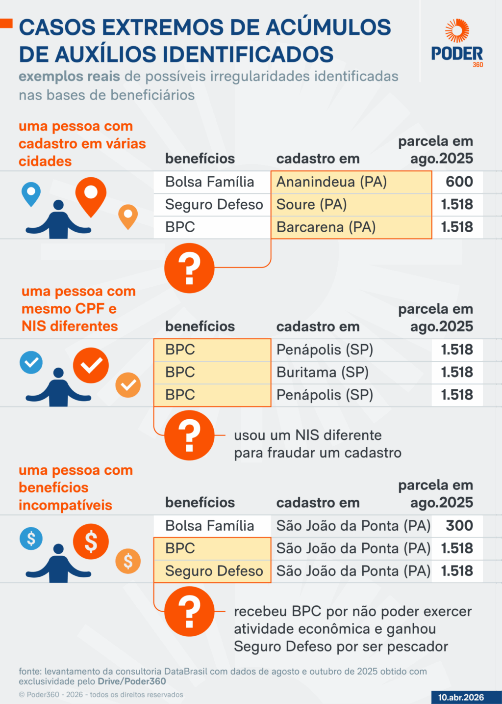 A consultoria DataBrasil encontrou dezenas de milhares de indícios de fraudes em auxílios do governo. O Poder360 teve acesso aos dados com exclusividade e confirmou alguns desses casos no Portal da Transparência.