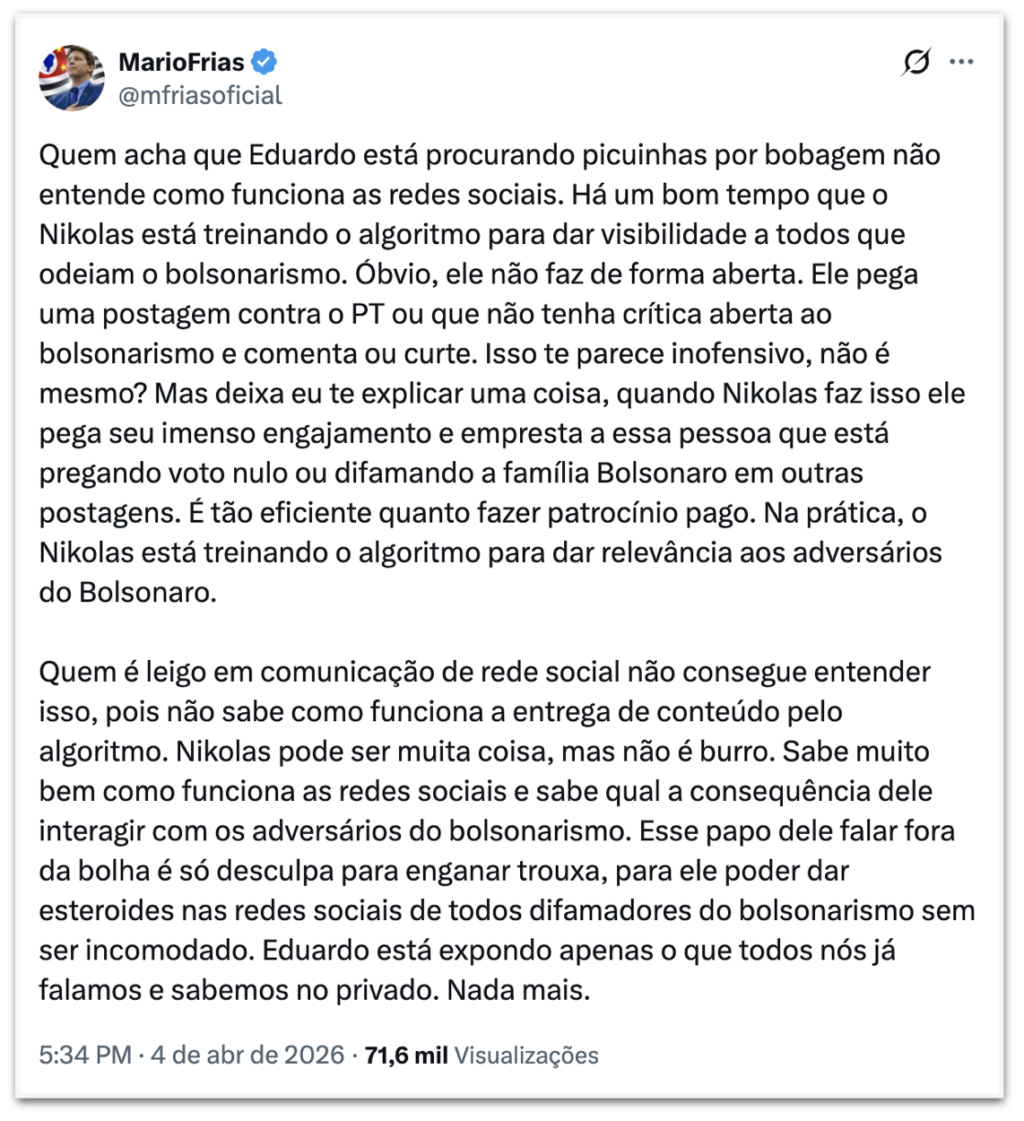 O deputado federal Mario Frias (PL-SP) afirmou neste sábado (4.abr.2026) que o também deputado Nikolas Ferreira (PL-MG) usa interações nas redes sociais para ampliar o alcance de conteúdos críticos ao bolsonarismo. Em publicação nas redes sociais, Frias disse que “há um bom tempo que o Nikolas está treinando o algoritmo para dar visibilidade a todos que odeiam o bolsonarismo”.