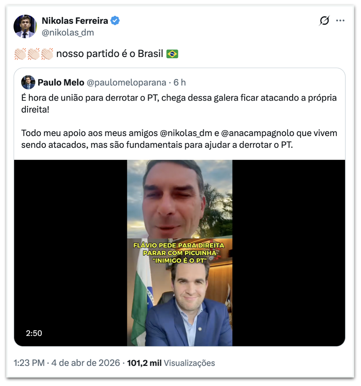 Apesar das críticas ao ambiente de conflito, a fala de Flávio foi compartilhada pelo próprio Nikolas Ferreira no mesmo dia.