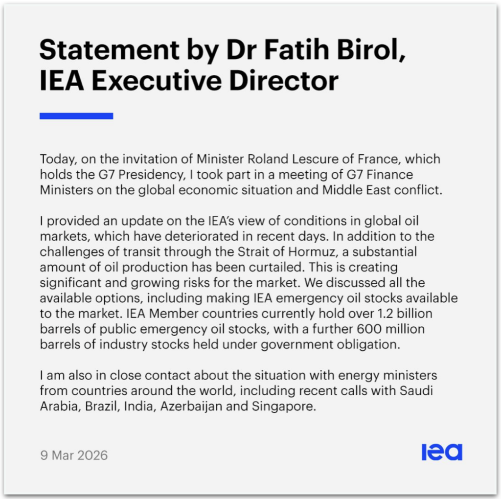 Os ministros de Finanças do G7 se reuniram em caráter emergencial, nesta 2ª feira (9.mar.2026), para discutir a escalada nos preços do petróleo por causa do conflito militar entre Irã e EUA no Oriente Médio. Uma das possibilidades consideradas foi disponibilizar os estoques emergenciais de petróleo da AIE (Agência Internacional de Energia) ao mercado –os países integrantes mantêm atualmente mais de 1,2 bilhão de barris de estoques públicos emergenciais.
