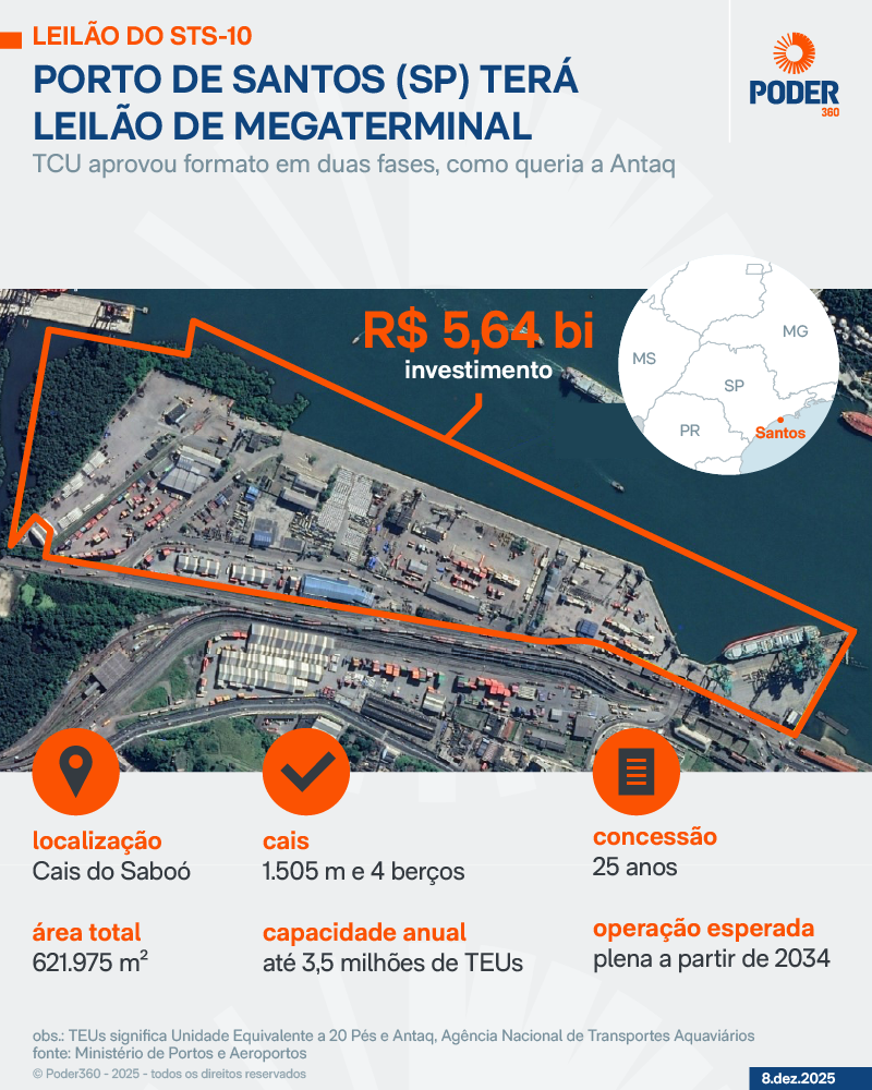 O ministro de Portos e Aeroportos, Silvio Costa Filho (Republicanos), afirmou nesta 2ª feira (23.fev.2026) que ainda não há um novo cronograma definido para publicação do edital do leilão do Tecon 10 (megaterminal de contêineres no Porto de Santos). Disse, porém, que o calendário será definido e apresentado ao presidente Luiz Inácio Lula da Silva (PT) assim que ele voltar da viagem à Ásia.