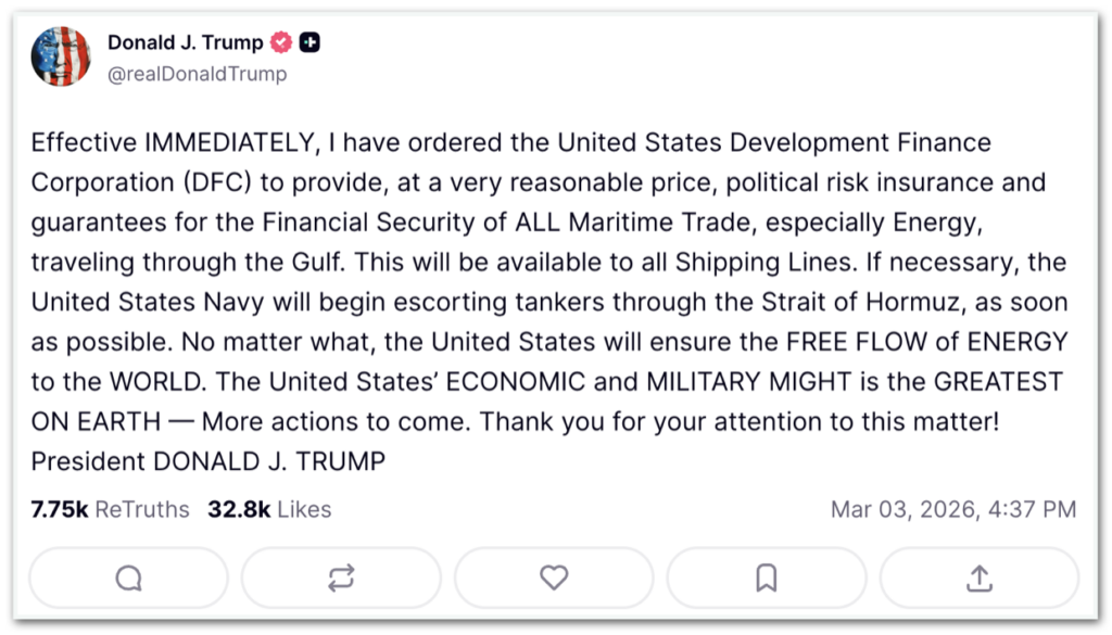Na última 3ª feira (3.mar), Trump disse que a Marinha norte-americana poderia começar a escoltar petroleiros na região. “Aconteça o que acontecer, os Estados Unidos garantirão o livre fluxo de energia para o mundo”, escreveu o republicano em uma publicação na plataforma Truth Social.