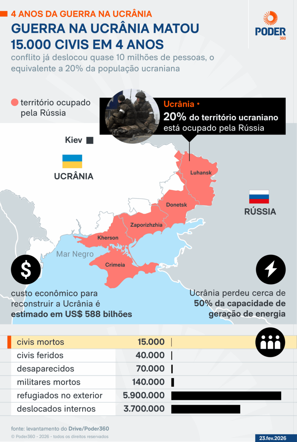 A guerra entre Rússia e Ucrânia chega ao seu 5º ano nesta 3ª feira (24.fev.2026) com impactos sobre civis, militares e infraestrutura. O conflito se consolidou como a guerra ininterrupta entre Estados mais duradoura na Europa desde a 2ª Guerra Mundial (1939-1945), com impacto devastador sobre civis, militares e infraestrutura.
