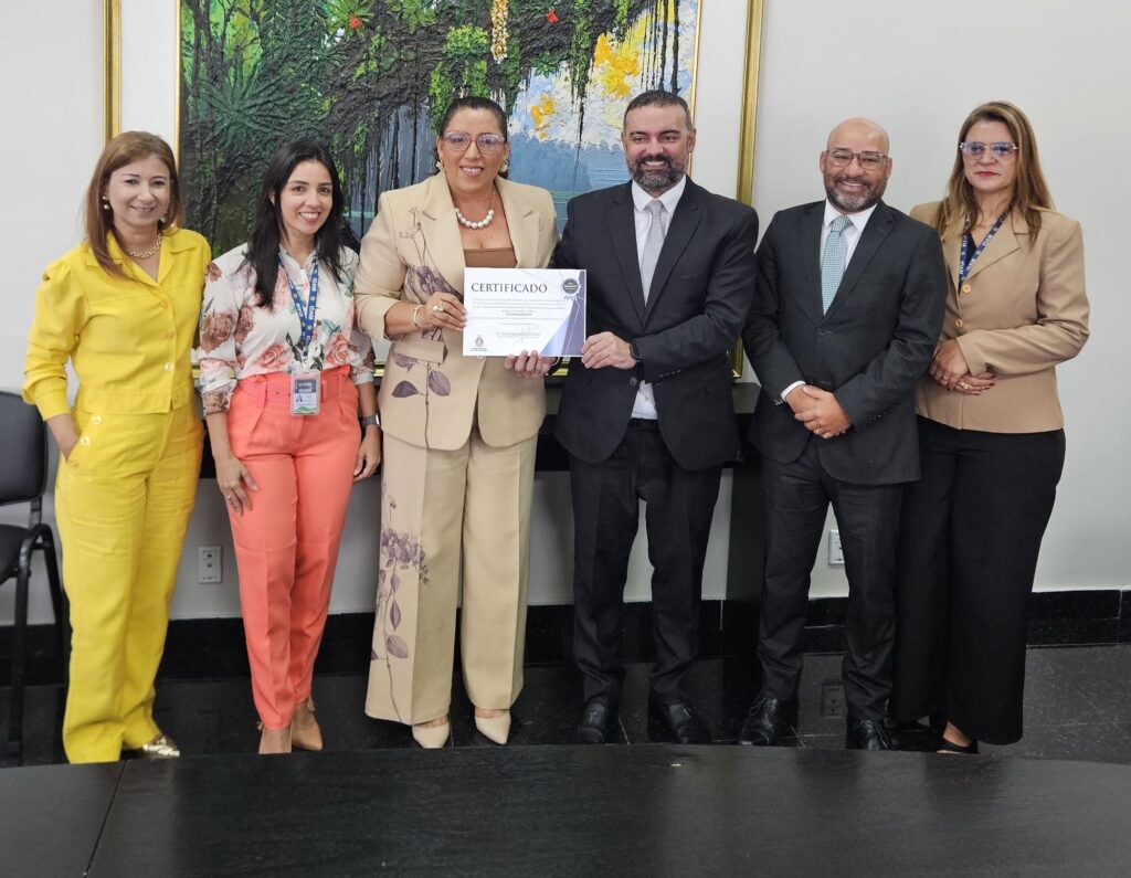 A certificação foi entregue à diretora-presidente do Idam, Eliane Ferreira, acompanhada da diretora-técnica, Nadiele Pacheco, do diretor de Planejamento, Victor Góes, e de servidores do instituto.