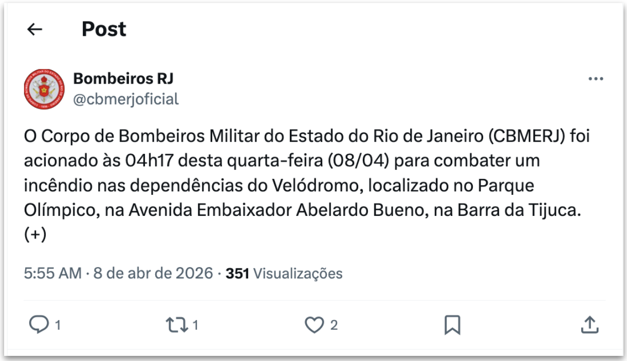 O Corpo de Bombeiros Militar do Estado do Rio de Janeiro combate um incêndio no Velódromo do Parque Olímpico, na Barra da Tijuca, zona oeste da capital fluminense. O fogo começou na madrugada desta 4ª feira (8.abr.2026) e foi controlado. A corporação recebeu o chamado às 4h17. Não há informações sobre feridos.
