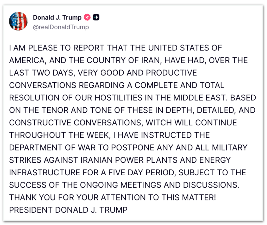 “Tenho o prazer de informar que os Estados Unidos da América e o Irã tiveram, nos últimos dois dias, conversas muito boas e produtivas sobre uma resolução completa e total de nossas hostilidades no Oriente Médio. Com base no teor e no tom dessas conversas aprofundadas, detalhadas e construtivas, que continuarão ao longo da semana, instruí o Departamento de Guerra a adiar todos e quaisquer ataques militares contra usinas de energia e infraestrutura energética iranianas por um período de cinco dias, sujeito ao sucesso das reuniões e discussões em andamento.