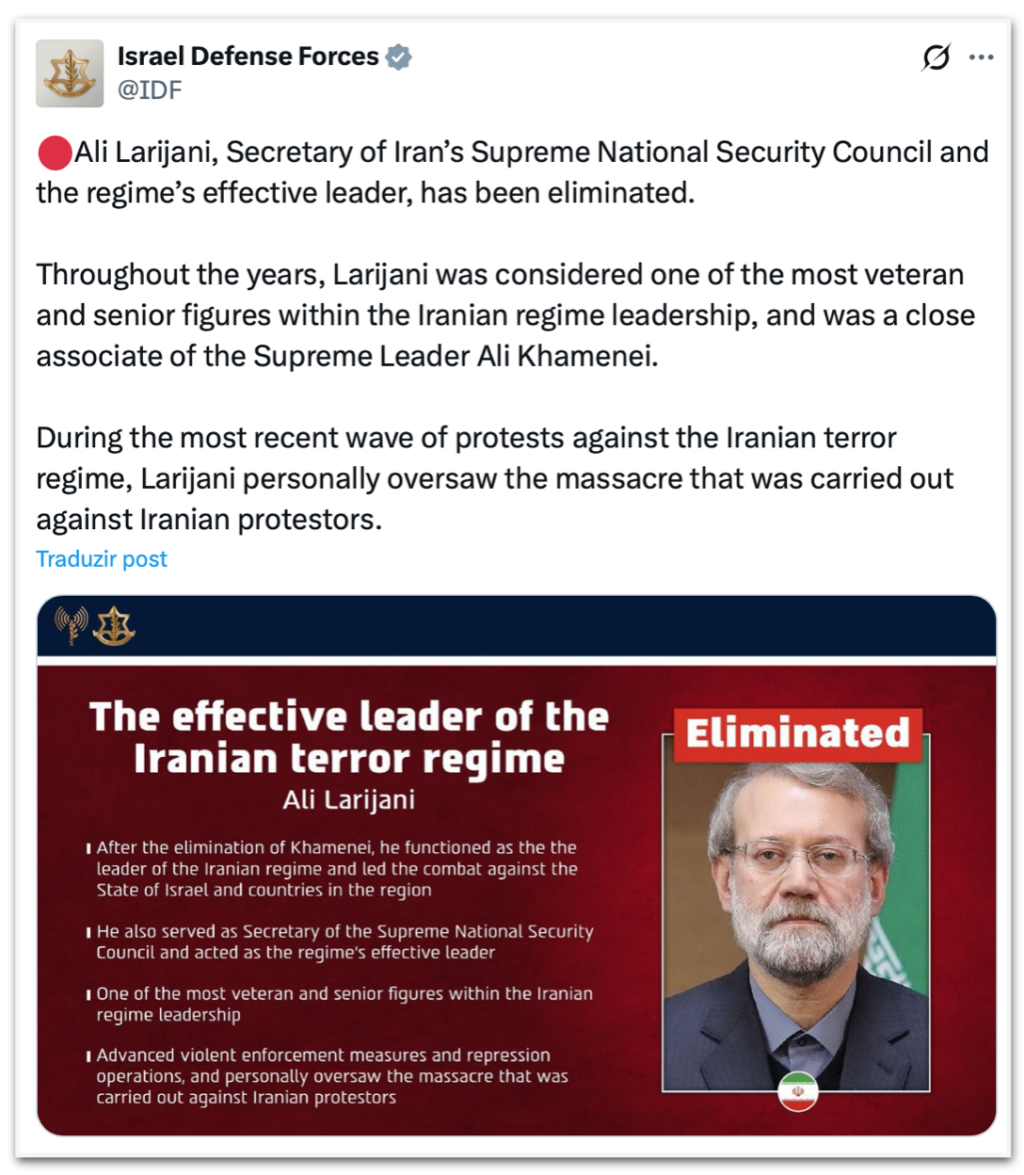 As IDF (Forças de Defesa de Israel) anunciaram em uma publicação na rede social X que Ali Larijani foi “eliminado”. Disseram que ele era o “líder efetivo do regime iraniano” depois da morte do aiatolá Ali Khamenei, em 28 de fevereiro.