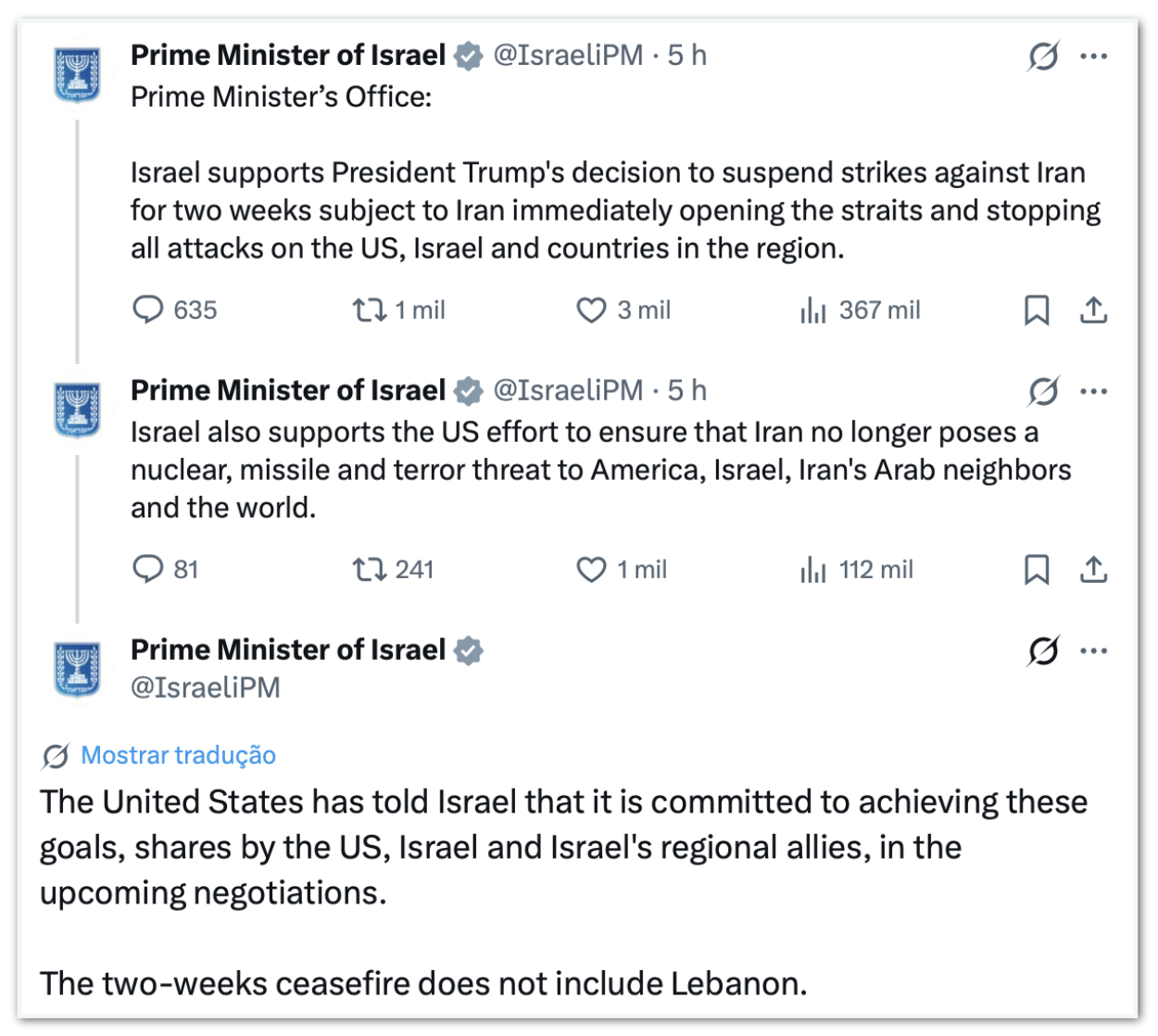 Segundo o comunicado, a trégua proposta se limita ao eixo direto entre Israel, Estados Unidos e Irã. “O cessar-fogo de duas semanas não inclui o Líbano”, afirmou o gabinete de Netanyahu.