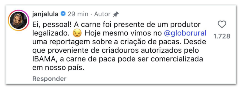 Após internautas questionarem nos comentários do post a procedência da carne, Janja afirmou que foi “presente de um produtor legalizado”.