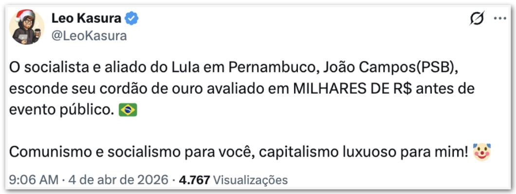 A oposição reagiu nas redes sociais. Um usuário do X escreveu: “O socialista e aliado do LuIa em Pernambuco, João Campos, esconde seu cordão de ouro avaliado em MILHARES DE R$ antes de evento público. Comunismo e socialismo para você, capitalismo luxuoso para mim!”.