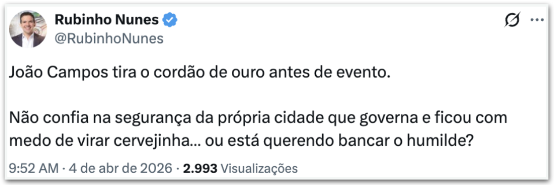 Já o vereador de São Paulo, Rubinho Nunes (União Brasil), escreveu: “não confia na segurança da própria cidade que governa e ficou com medo de virar cervejinha… ou está querendo bancar o humilde?”.