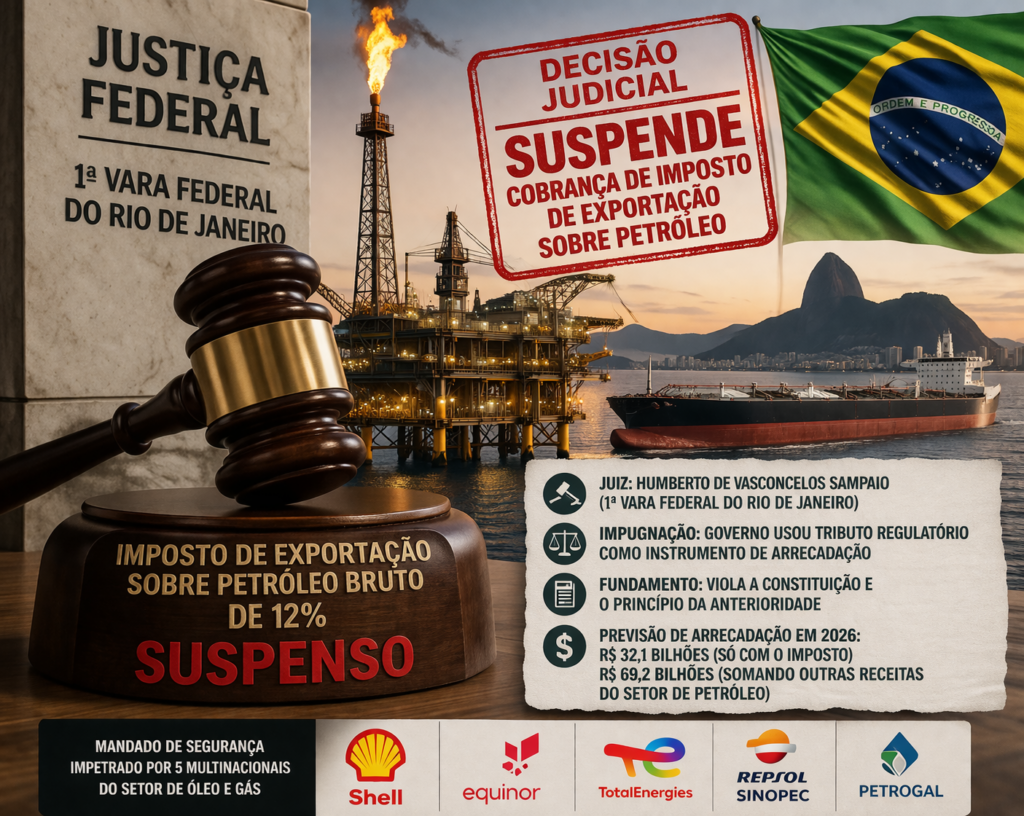 RIO DE JANEIRO – 07/04/2026 – O juiz federal Humberto de Vasconcelos Sampaio, da 1ª Vara Federal do Rio de Janeiro, suspendeu na 3ª feira a cobrança do Imposto de Exportação sobre o petróleo bruto, de 12%, instituído pelo governo de Da Silva (PT) via medida provisória anunciada em 12 março.