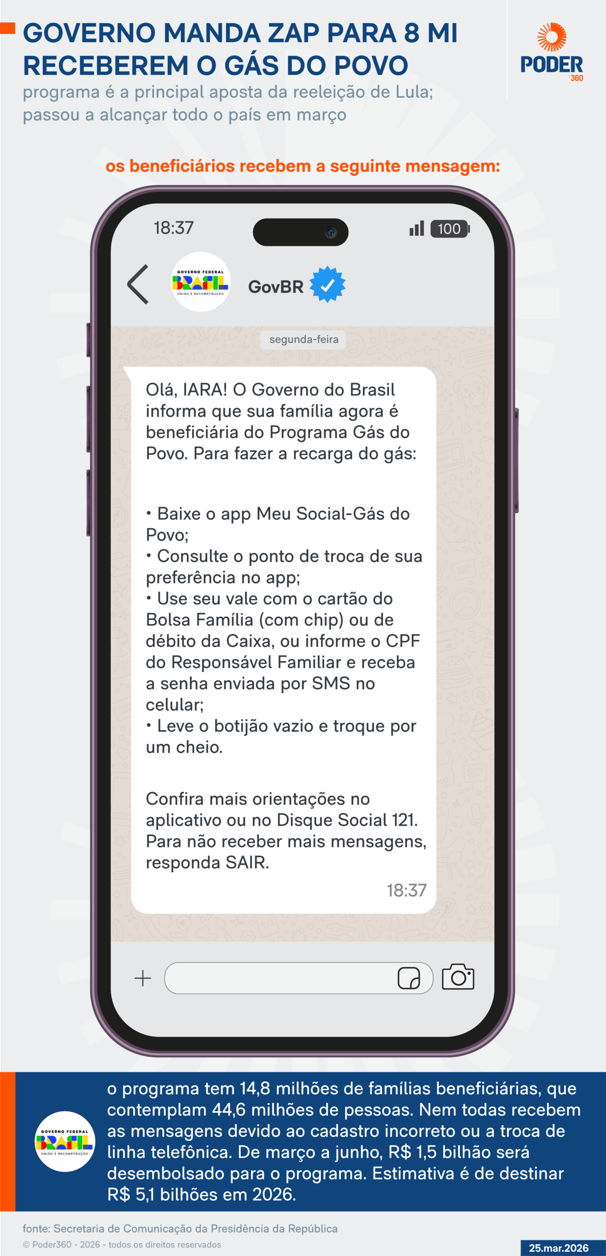 - Entenda o que houve – o Poder360 mostrou em 26 de março que o governo está enviando mensagens sobre o Gás do Povo para 8 milhões de pessoas, instruindo-as a como ter acesso a um botijão de gás pelo aplicativo Meu Social-Gás do Povo. O programa foi lançado em setembro de 2025. É uma das apostas de Lula para 2026 –ano eleitoral. Ao todo, quase 15 milhões de famílias são contempladas. Em 2022, a diferença de votos entre Lula e o ex-presidente Jair Bolsonaro (PL) foi de 2,1 milhões.