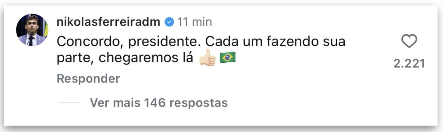 Nikolas comentou no post: “Concordo, presidente. Cada um fazendo sua parte, chegaremos”.
