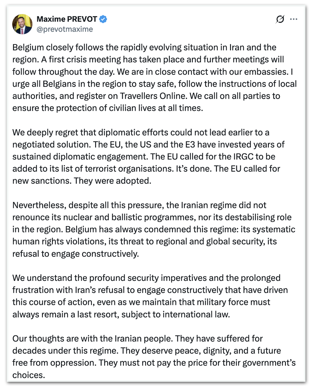 “Garantir a segurança nuclear e prevenir quaisquer ações que possam agravar ainda mais as tensões ou prejudicar o regime global de não proliferação é de importância crucial”, escreveu em seu perfil no X.