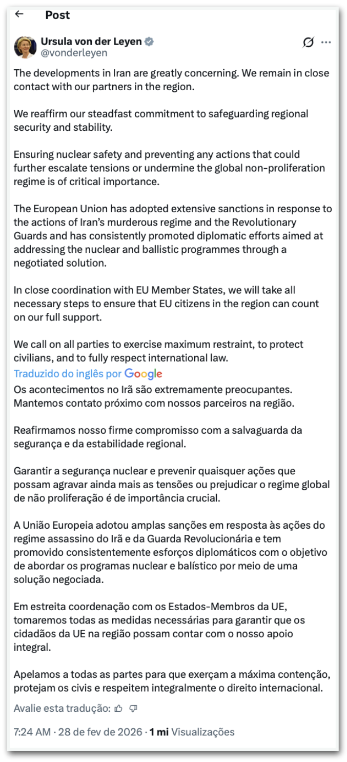 A presidente da Comissão Europeia, Ursula von der Leyen, classificou a ofensiva como preocupante. Pediu para que todos os envolvidos exerçam a máxima contenção e respeitem o direito internacional.