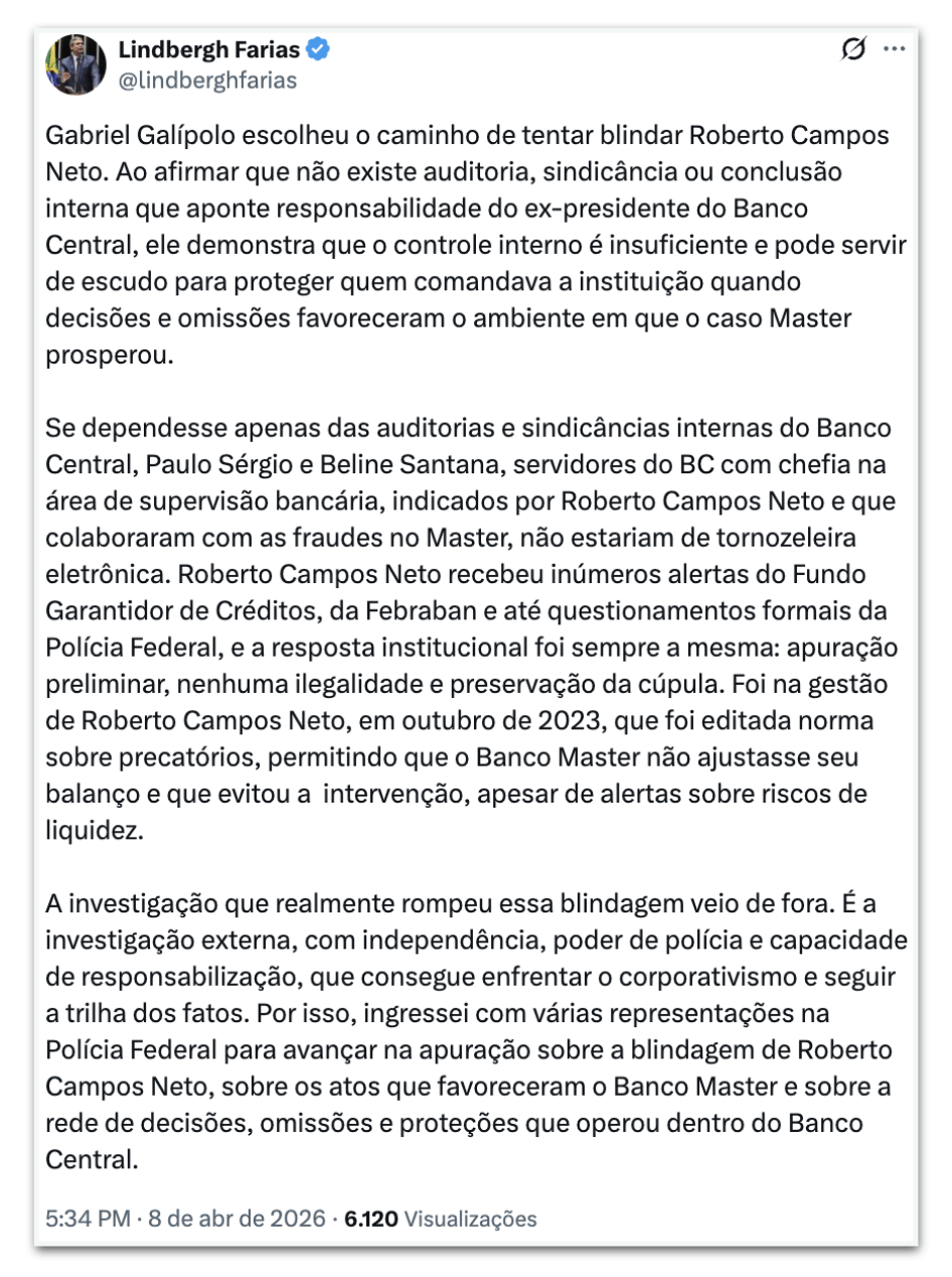 Segundo Lindbergh em seu perfil oficial no X, a declaração do presidente do BC “demonstra que o controle interno é insuficiente e pode servir de escudo para proteger quem comandava a instituição quando decisões e omissões favoreceram o ambiente em que o caso Master prosperou”.