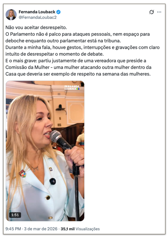 Nas redes sociais, Louback disse que “não vai aceitar desrespeito” e afirmou que, enquanto estava na tribuna, sofreu interrupções, gestos e gravações com intuito de deboche. Ela criticou o fato de a atitude ter partido da presidente da Comissão da Mulher, “na semana das mulheres”.