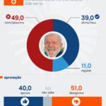 Segundo a pesquisa, 9,2% dos entrevistados avaliaram o trabalho de Lula como “ruim” e 32,9% como “péssimo”. Já 17,5% dos eleitores responderam que a administração do presidente é “boa”. Outros 10% disseram ser “ótima”, enquanto 29% consideraram “regular”.